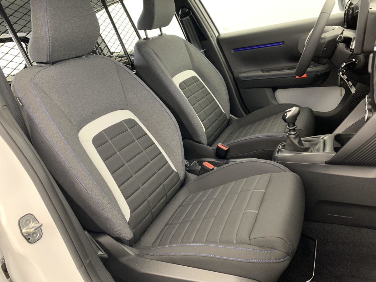 garnissage tissu noir / tissu asphalt avec ambiance urban grey + sièges advanced comfort - comprend les décors sur les panneaux de portes av/ar et sur la planche de bord ultra blue, le siège conducteur réglable en hauteur, les appui-têtes av réglables en hauteur, les accoudoirs de porte av et ar recouverts de textile moussé avec étiquettes « happy tags » (messages positifs), et des poches aumônières au dos des sièges av