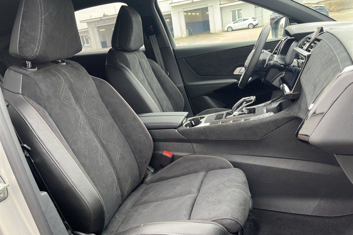 intérieur alcantara noir profond : console centrale en alcantara noir profond panneaux de portes en alcantara noir profond et surpiqûres carmin et or planche de bord alcantara noir profond et surpiqûres carmin et or volant cuir fleur perforé et coutures carmin et or sièges alcantara noir profond avec toile ds