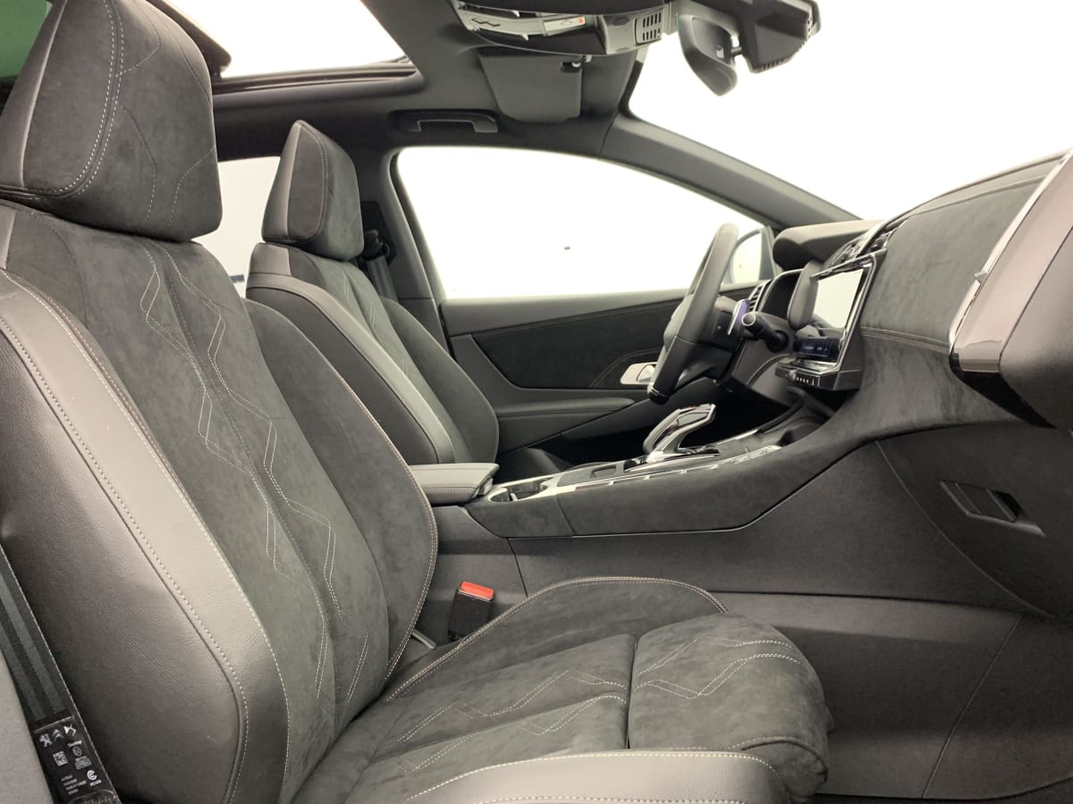 intérieur alcantara noir profond : console centrale en alcantara noir profond panneaux de portes en alcantara noir profond et surpiqûres carmin et or planche de bord alcantara noir profond et surpiqûres carmin et or volant cuir fleur perforé et coutures carmin et or sièges alcantara noir profond avec toile ds