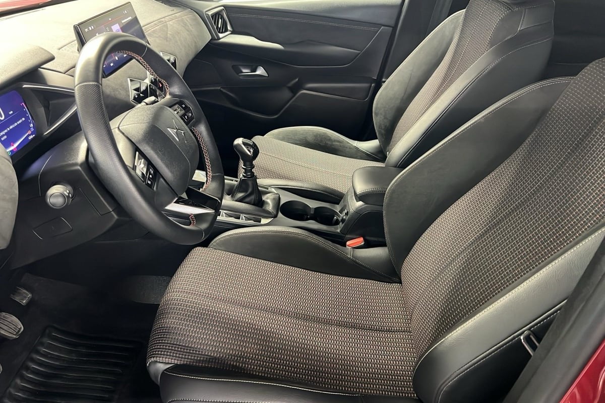 intérieur tissu tressé basalte avec alcantara : planche de bord alcantara noir ciel de pavillon gris galet volant cuir fleur perforé et coutures or et carmin décor alcantara noir siège tissu tressé basalte avec alcantara