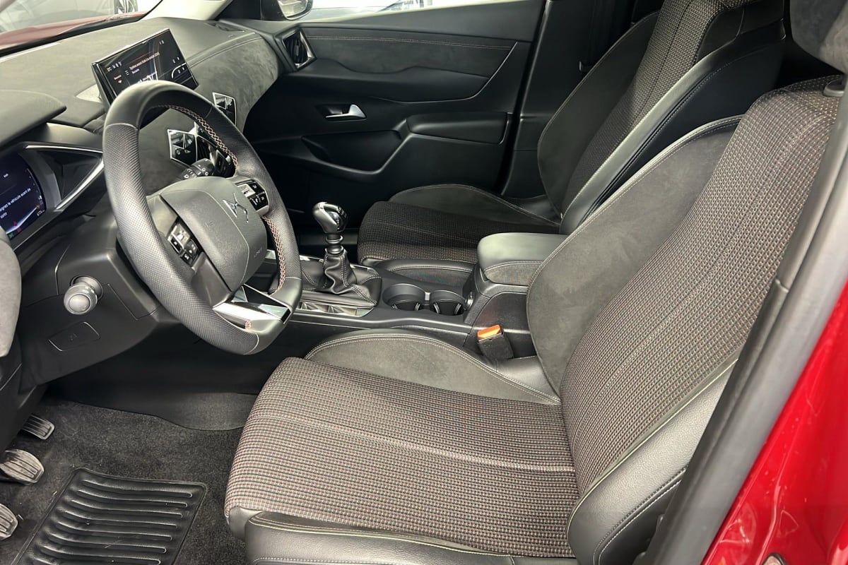 intérieur tissu tressé basalte avec alcantara : planche de bord alcantara noir ciel de pavillon gris galet volant cuir fleur perforé et coutures or et carmin décor alcantara noir siège tissu tressé basalte avec alcantara